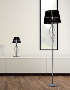 8010/STL1 Crystal pearls cover the delicate shapes of the chromium-plated frames. The hangings of shining crystal with 30% of lead contrast the delicate lampshades of black silk organza.