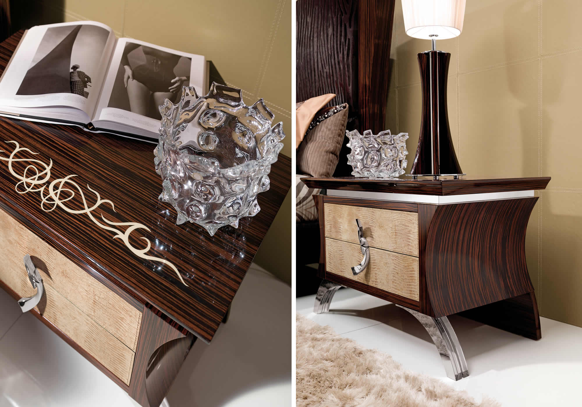 Восхитительные предметы мебели фабрики производятся на современном высокоточном оборудовании, но кроме этого многие работы традиционно выполняются ручным способом. Компания уделяет огромное внимание качеству и экологичности своей продукции. Для изготовления мебели основным материалом служит массив древесины ценных пород, кроме этого используется также натуральный шпон, металл, закаленное стекло и превосходный текстиль или кожа. В декоре присутствуют различные вставки, восхитительная роспись, ажурная резьба и тонировка.