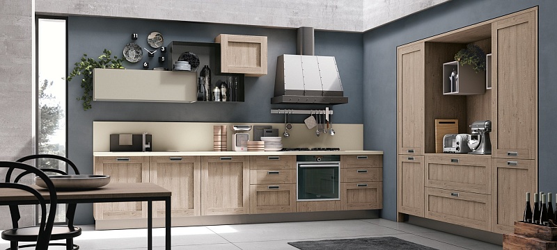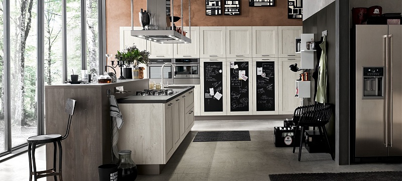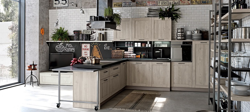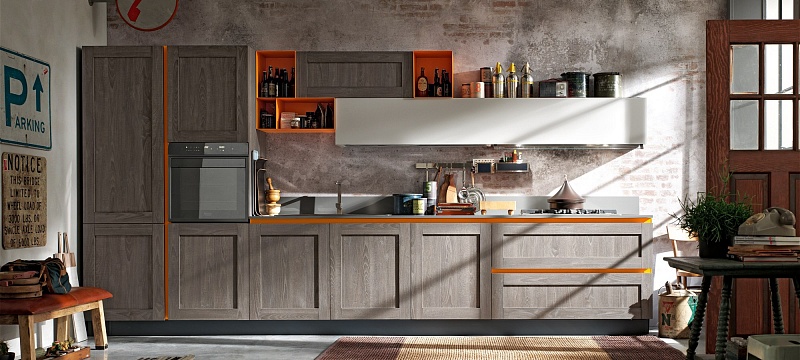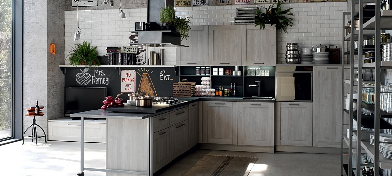 Добро пожаловать на новую кухню City, вдохновение, черпаемое от винтажа: дизайн прошлого, интерпретируемый в современном ключе для создания необычного и креативного стиля. Глубокая и решительная эстетика этой кухни способна предложить интересные тактильные и визуальные ощущения. Неровные поверхности в отделке дуб джинс, дуб «бриццо», белый дуб или в песочном цвете сочетаются с предметами меблировки из металла и металлического листа, уникальными вариантами отделками, как, например, «аспидный цемент», которые создают атмосферу «индустриального стиля».