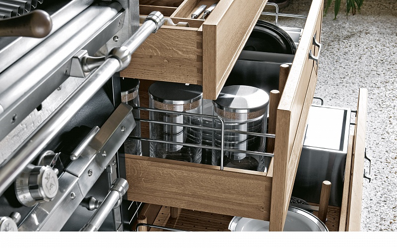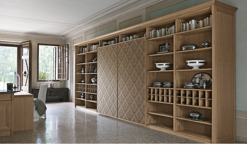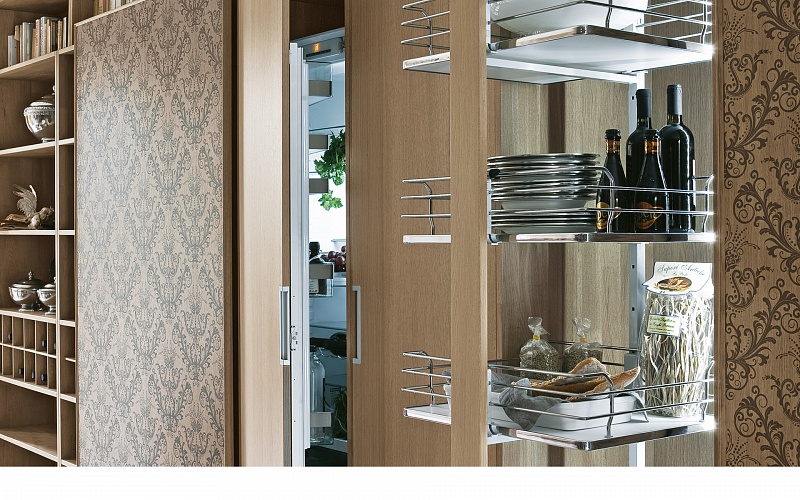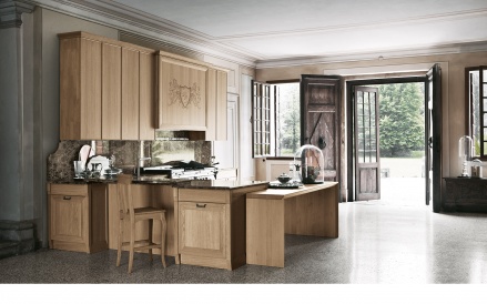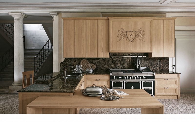 Эту кухню отличает вневременная элегантность, характеризуется конструктивными элементами, декорами и персональной отделкой инициалами семьи. Кухня с богатым и обволакивающим внешним видом, но в то же время оснащенная внутри современными выдвижными механизмами, колоннами и ящиками.