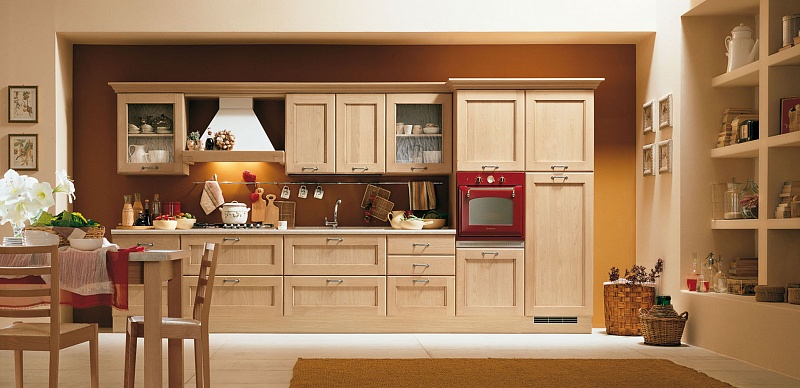 Кухонный гарнитур традиционных очертаний поставляется в цветах AVORIO (слоновой кости), AZZURRO (голубой), FRASSINO SCURO (темный бук) и ROVERE CHIARO (светлый дуб). Оригинальная ручка, которая подходит как для гарнитуров в классическом, так и в современном стиле. Богато смотрится элемент для вытяжки Country из массива в цвет кухни с конусом из нержавеющей стали или белого цвета. Широкая гамма бытовой техники для придания кухни динамичности, которая всегда в моде.