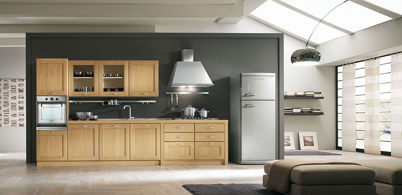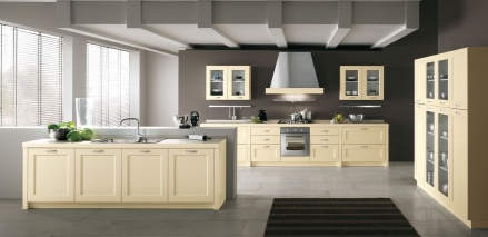 Традиционность линий кухонного гарнитура в цветовой гамме AVORIO (цвет слоновой кости), AZZURRO (голубой), FRASSINO SCURO (светлый ясень) и ROVERE CHIARO (светлый дуб). Ручка идеально сочетается как с гарнитурами в классическом, так и современном стиле. Элемент под вытяжку Country из массива в тон кухни и конус из нержавеющей стали или белого цвета, а также широкая гамма бытовой техники делают кухню динамичной и неподвластной тенденциям и модам. Рама: массив ясеня, панель: ДСП, шпон - ясень.