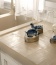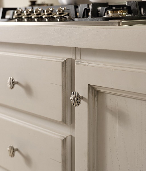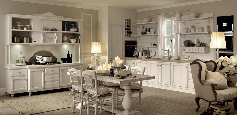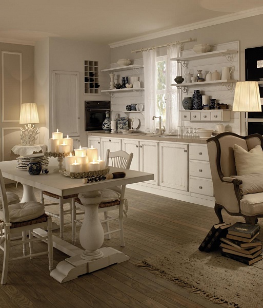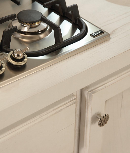 Очаровательное решение, в котором чистый белый цвет, придающий помещению изысканность и шик, разбавляется только светлой, серовато-коричневой столешницей, которая делает интерьер светлее и просторнее.