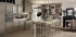 Отличительным элементом этого гарнитура служит наличие двух рабочих зон. Первая представляет собой стенку с грушевидной вытяжкой, предназначена для готовки и отличается фигурным фасадом с эффектом «стены». Вторая зона с мойкой выполнена в виде острова со специальной конструкцией на трех цилиндрических ножках, используемой в качестве барной стойки.