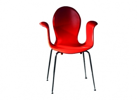 Стул с подлокотниками, жесткие сидение и спинка.Стул обит кожей, также можно покрасить в белый или черный цвет. Отделка: хром или крашеная.