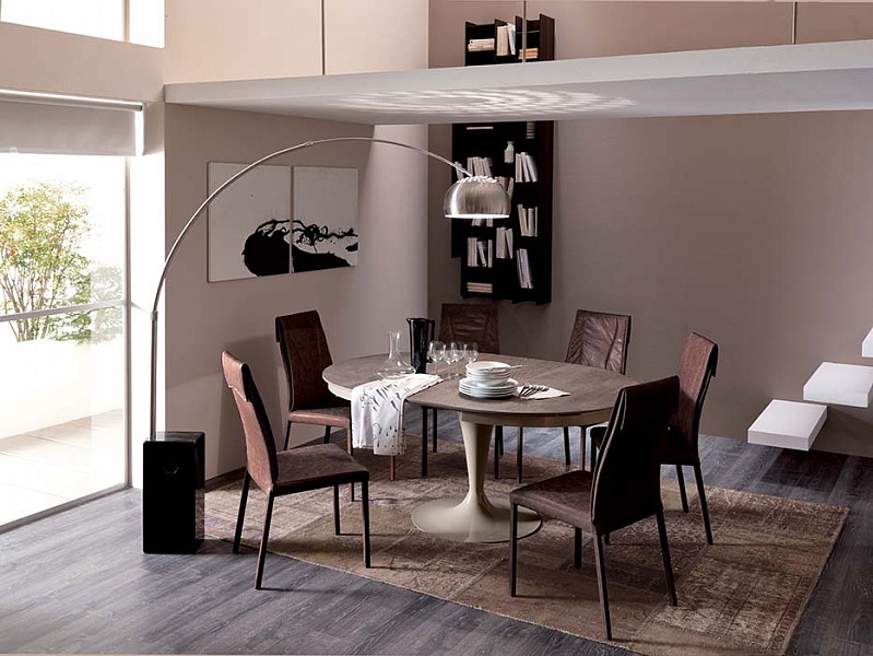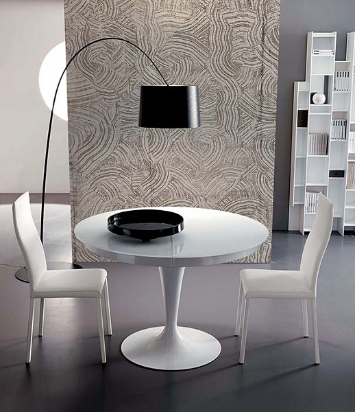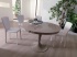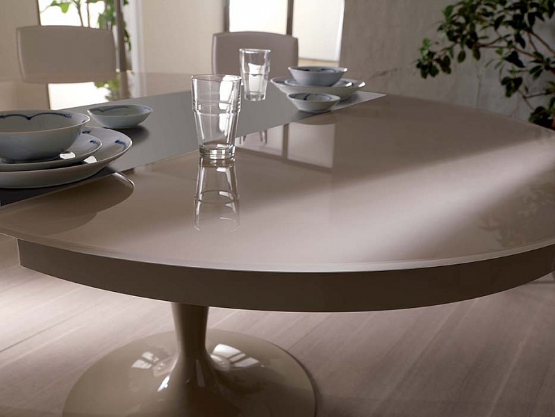 Раздвижной стол для гостиной с металлическим основанием, стеклянная столешница, центральная дополнительная секция в меламине в цвет столешницы.