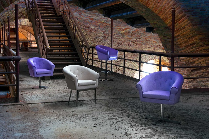 Коллекция включает 4 модели барных и полубарных кресел, в том числе вращающихся, выполненных на каркасе из трубчатого хромированного металла. Опорой служат металлические крестовидные ножки, простые металлические ножки или металлическое круглое основание; доступна модель с круглой подножкой. Спинка украшена стежкой капитоне, обивка - яркий однотонный текстиль из ассортимента компании.