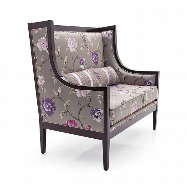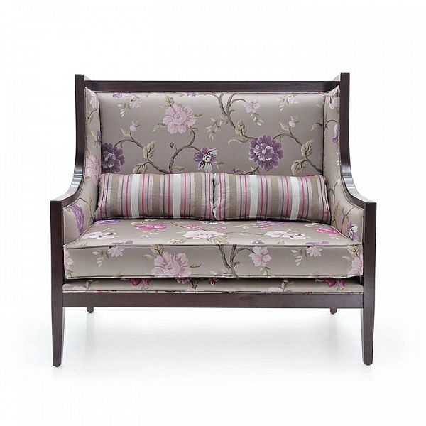 Удобный двухместный диван в современном стиле из древесины бука, обитый хлопком с рисунком в клетку и подушкой сидения тканью в клетку с контрастным оттенком. Лаковая поверхность в цвете "черный старинный", а набивка сидения выполнена из ремней и пористой резины.